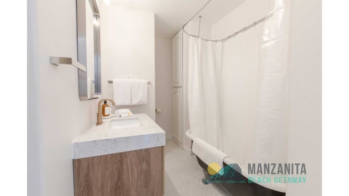 This cottage will keep you cozy in the primary bedroom with a king-sized bed and an en-suite bathroom. If you have guests, there are also two spacious bedrooms with queen beds. The nearby bathroom boasts a clawfoot tub and shower for you to wash.
