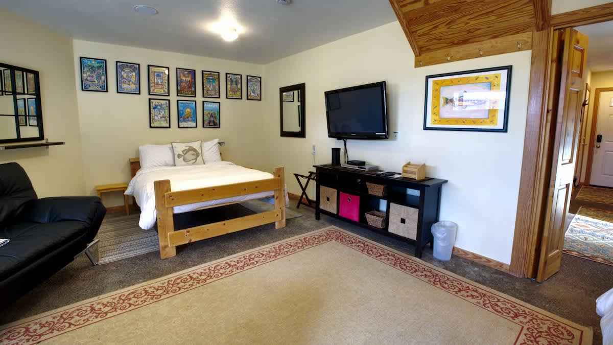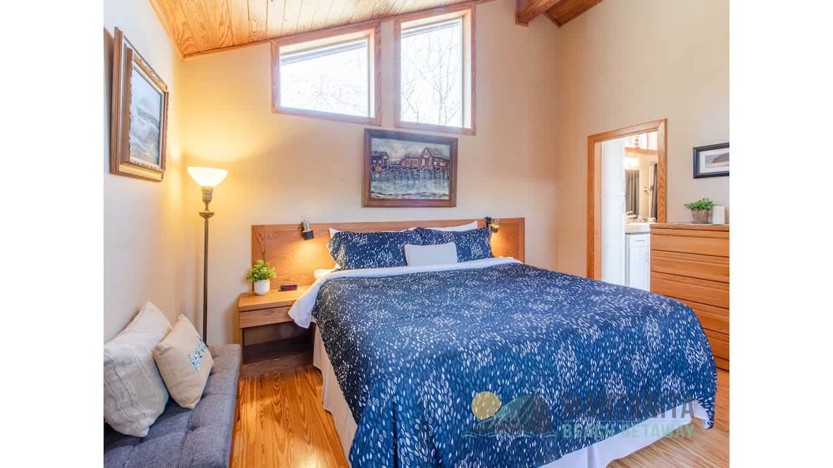 The beautiful primary bedroom, just down the hall from the living area, features a king-size bed, wall-mounted TV, and ample windows, allowing more natural lighting. There is also access to the vast wrap-around deck from this room and a private door to the hall bath with a tub and shower.