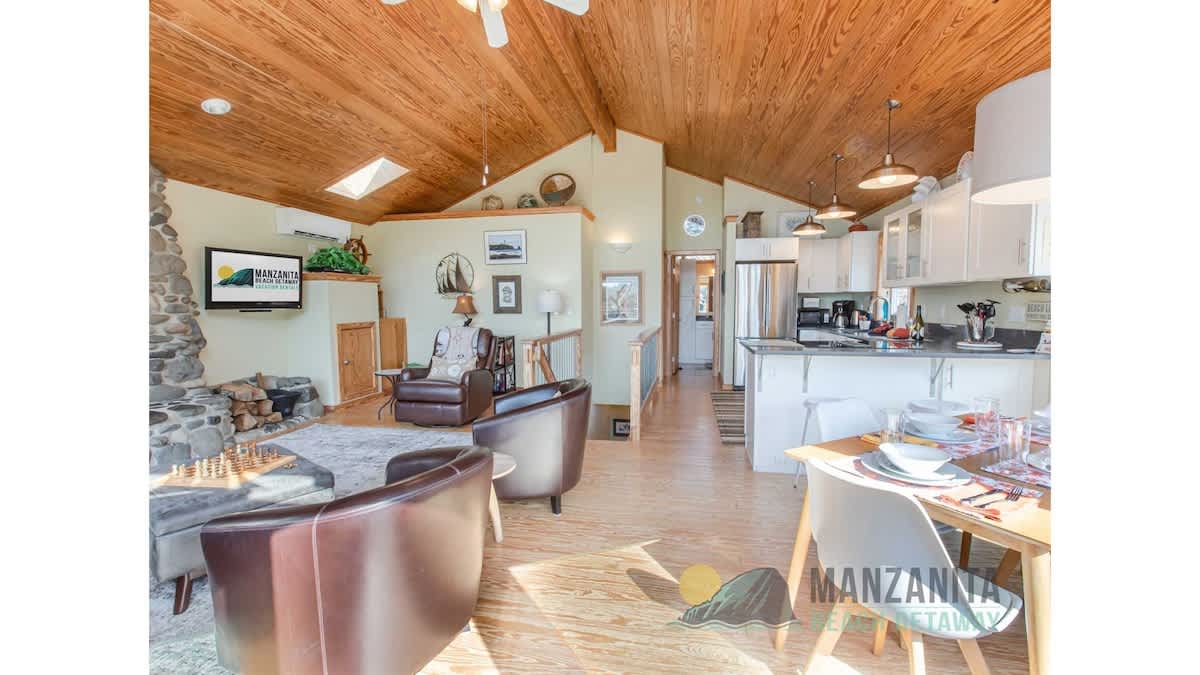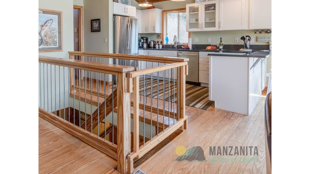 We thoroughly enjoyed our stay. The communication with Manzanita Beach Group was excellent. Super friendly and thoughtful. The house was as described. Extremely clean, comfortable, quiet, and had every amenity we could possibly need! They even had a little basket of necessities for our dog. The walk to the beach was fast and easy… and trip into town a breeze! The stairs were mentioned in previous reviews and we did have issues with them. They are no joke… our dog did not like the aggregate concrete at all. He is almost 40 pounds and does not like being picked up so getting him up and down was a challenge, but I don’t count that as a negative to the property. We made it work. Lovely home for sure!