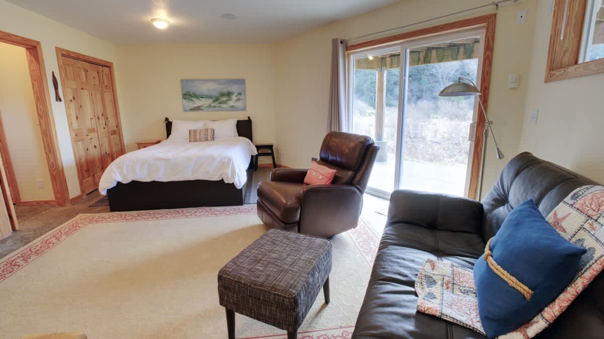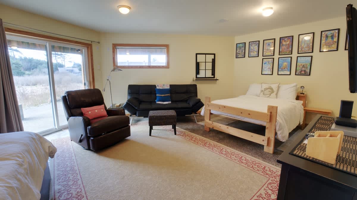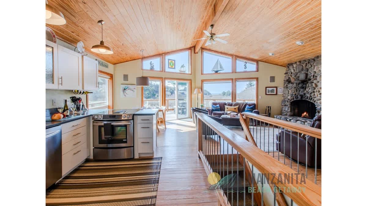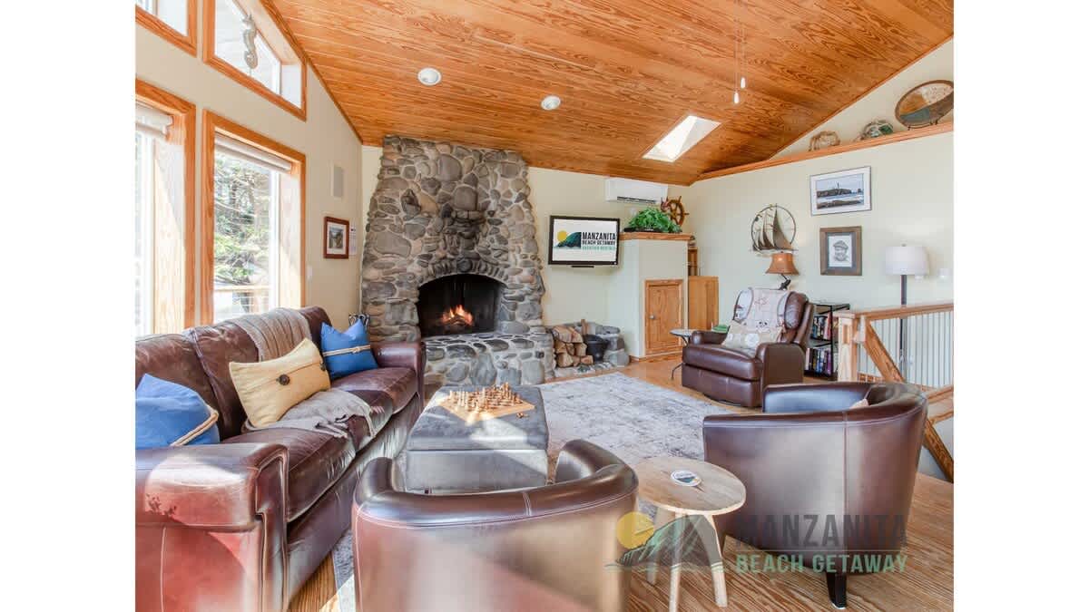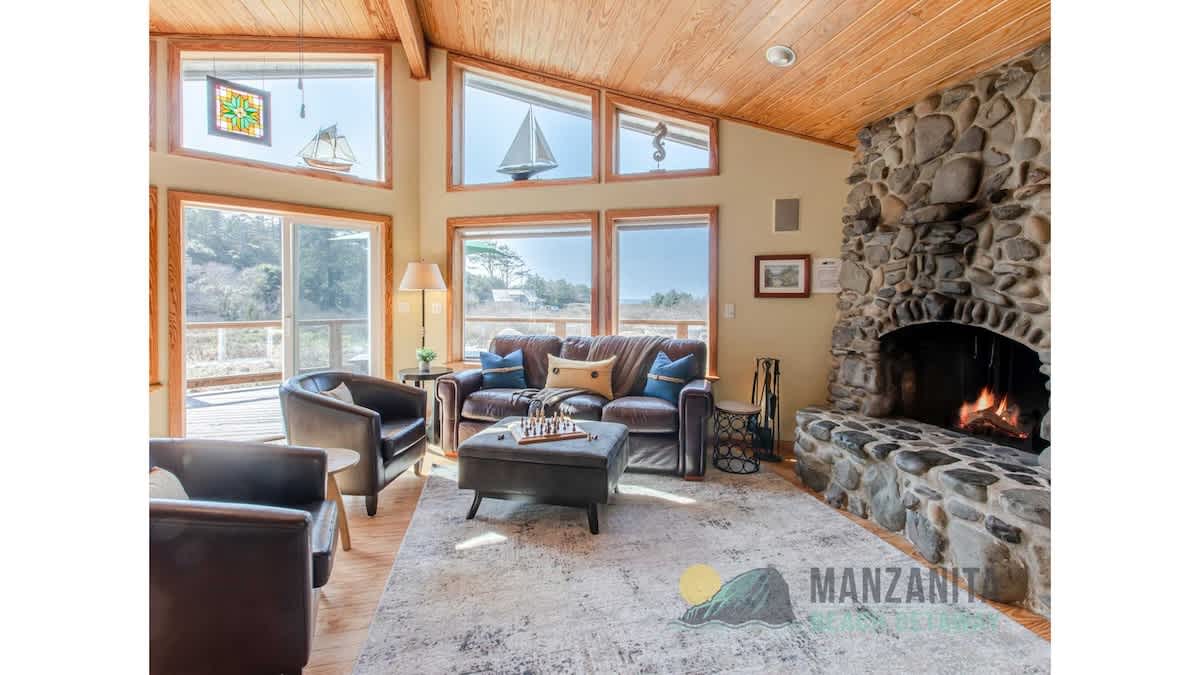 Legasea on the Pond is the perfect retreat for two couples or a family with children. This home offers a reverse floor plan with the main living area and primary bedroom on the upper level and a large second bedroom on the lower entry level. The open floor plan, with wood floors throughout the kitchen, living, and dining area, creates a rich, warm atmosphere for enjoying time with loved ones in a beautiful space. The living room has the feel of a small lodge with large windows that face west, allowing in lots of natural light. Cozy into the plush leather furnishings and enjoy a fire in the floor-to-ceiling, river-rock, wood-burning fireplace while watching a beautiful Oregon coast sunset.