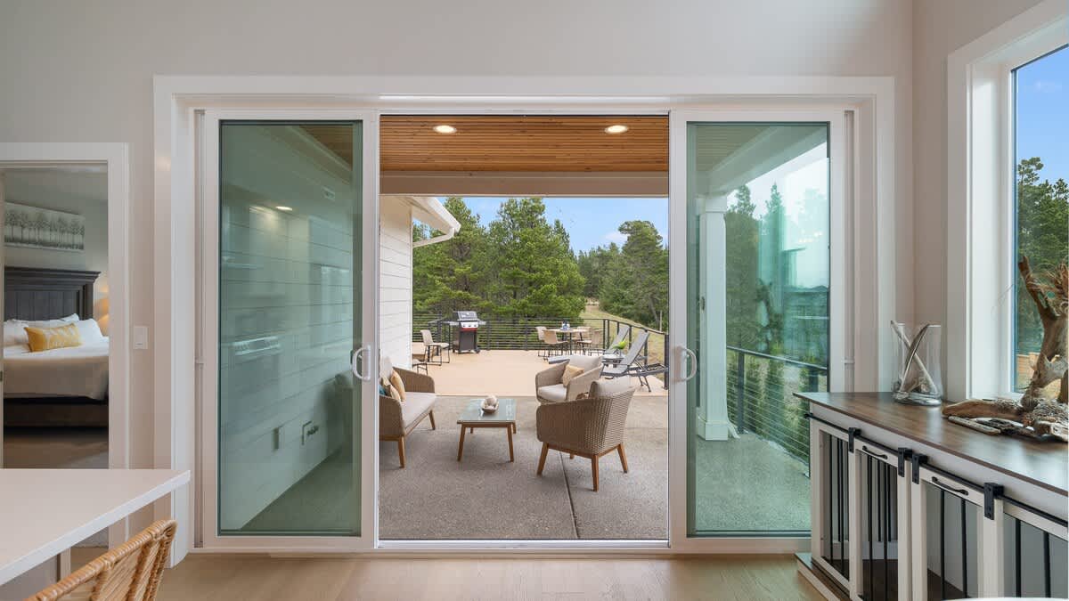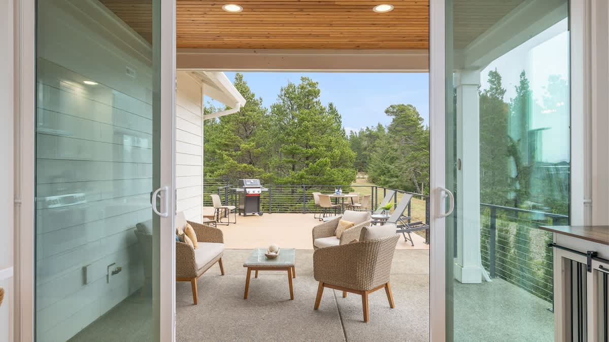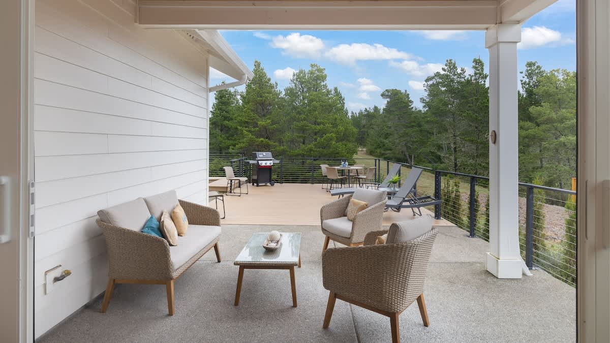 Step outside to your spacious private patio, where you’ll find a large sand area with a large wood burning fire pit, comfortable lounge seating, and beautiful views of the green meadow that stretches behind the property. It’s the perfect place for morning coffee, evening cocktails, or stargazing by the fire. Keep an eye out for local wildlife—elk are frequent visitors to the meadow, adding a touch of magic to your stay.