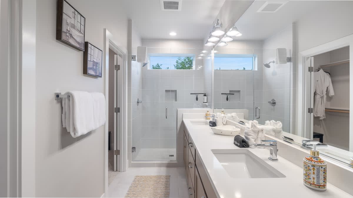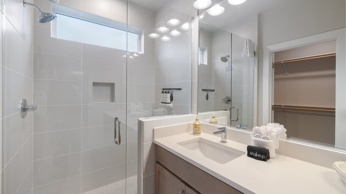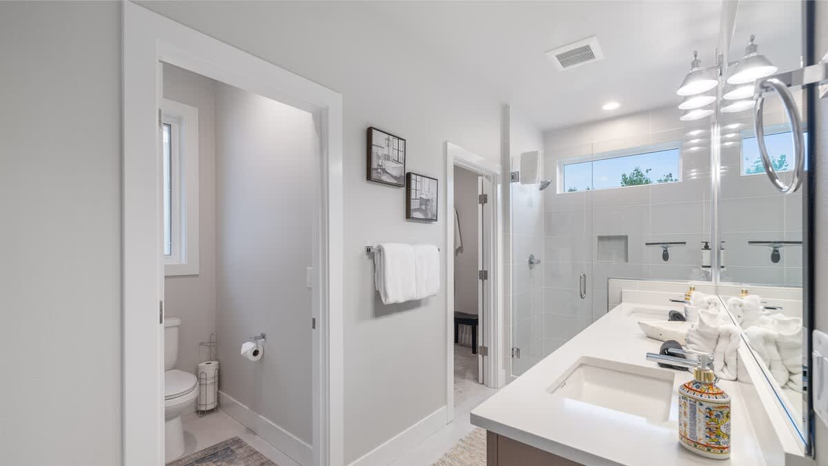 Primary Suite (Main Floor): A relaxing retreat with a plush king bed, ensuite bathroom with dual sinks and walk-in shower, and easy access to the main living areas.