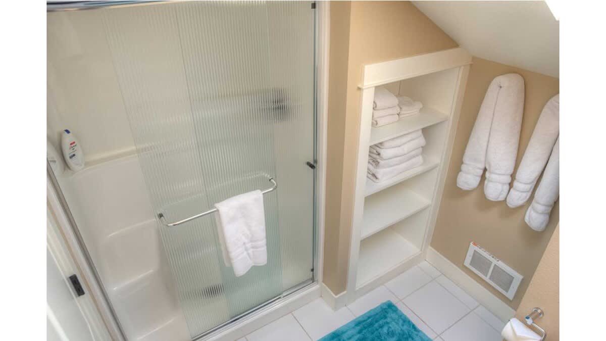 There are two queens and one king bedroom downstairs and two king bedrooms upstairs. The king bedroom downstairs has an en suite bathroom with a deep soaking tub, walk-in, tile shower, and double vanities. There is a main bathroom with a tub and tile shower in the hall next to the queen bedrooms. The full bath upstairs has a shower and beautiful skylight.